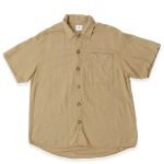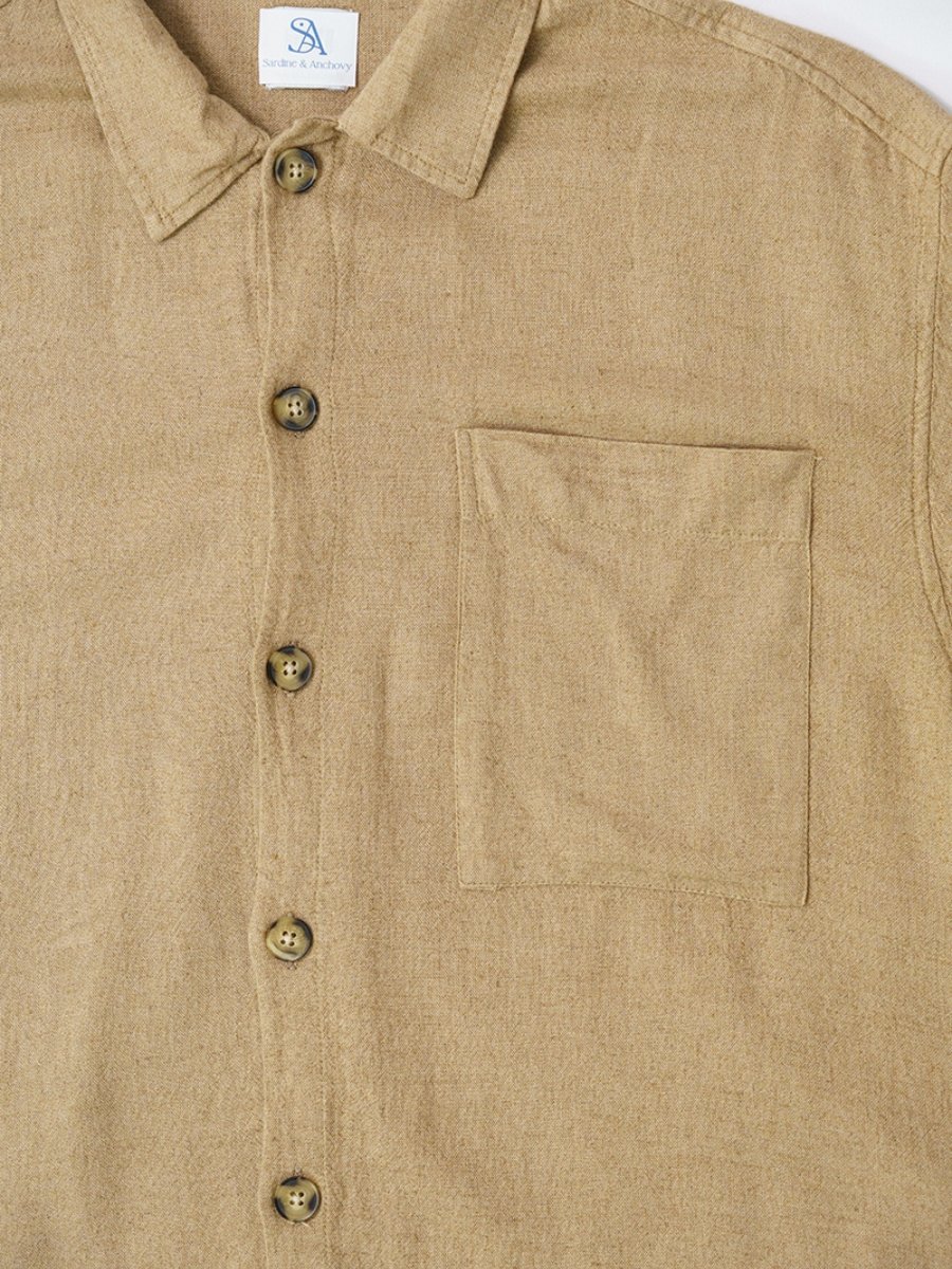 Oversize, μπεζ, κοντομάνικο λινό με βισκόζη πουκάμισο με τσέπη στο στήθος και χαμηλωμένους ώμους. Oversize και λινό για μέγιστη άνεση και δροσιά. Ελαφρώς μακρύτερο στην πλάτη.