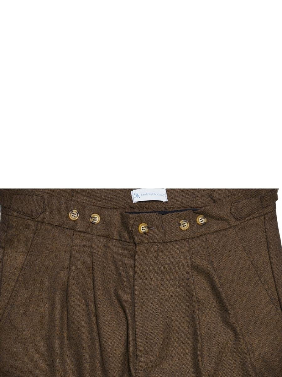 Βαμβακερό ψηλόμεσο παντελόνι φανέλας σε καφέ, διπλές πιέτες, ρυθμιζόμενη μέση, 2 πλαϊνές τσέπες και 2 τσέπες στην πλάτη. Το βαμβακερό ύφασμα φανέλας και η κανονική γραμμή με ελαφρώς πιο σφιχτές και κοντές μανσέτες προσφέρουν ζεστασιά, κομψή και μοντέρνα εμφάνιση τόσο για επίσημες όσο και για casual περιστάσεις.