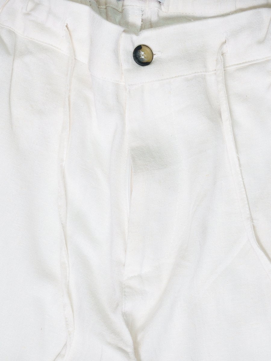 White linen blend, loose fit trouser with covered elastication, a drawstring, a zip fly, 2 side pockets and a back pocket. Loose fit and linen for maximum comfort, breathability and blend with viscose from wood pulp for absorption and perfect shape. Slight stretch for extra comfort. 90% linen 10% viscose.