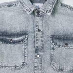 Grey cotton denim overshirt. Press-stud down the front. Chest front pockets with flaps and press-stud. Turn down collar. Regular fit for everyday wear. 98% cotton 2% elastane.