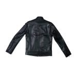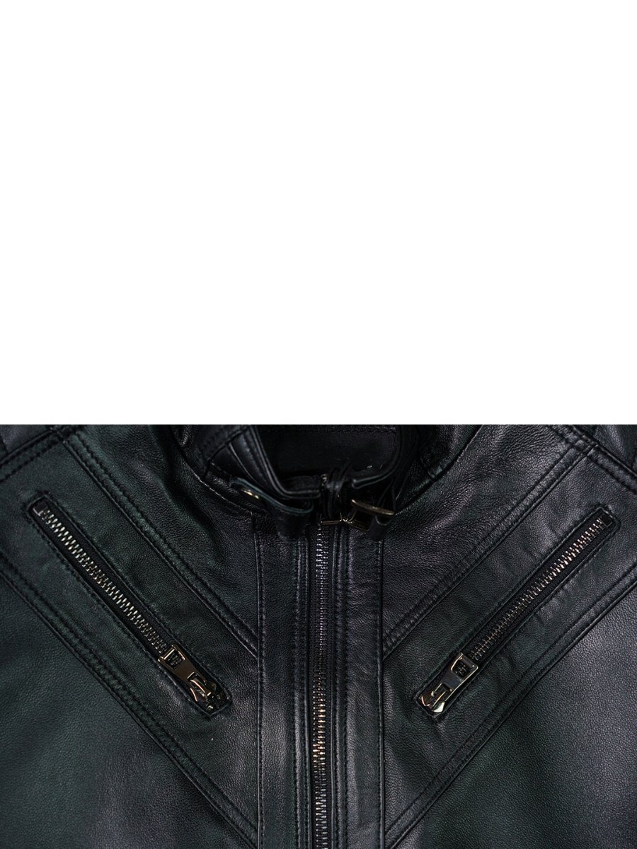 Black 100% lambskin leather jacket. Features two external side pockets with zippers and two inside pockets, long sleeves, front zip closure and stitch detailings on shoulders Outer shell 100% lambskin, inner shell 100% satin.